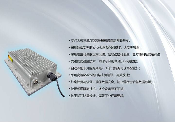 SHS24R高頻讀頭是專門為校訊通考勤系統(tǒng)設(shè)計(jì)的2.4G遠(yuǎn)距離RFID讀卡器,負(fù)責(zé)遠(yuǎn)距離自動(dòng)設(shè)別和讀取學(xué)生佩帶或攜帶的學(xué)生智能卡,并將數(shù)據(jù)傳給主機(jī)進(jìn)行處理, 實(shí)現(xiàn)無(wú)障礙遠(yuǎn)距離自動(dòng)考勤。采用增益可調(diào)的定向天線設(shè)計(jì),高速485接口。